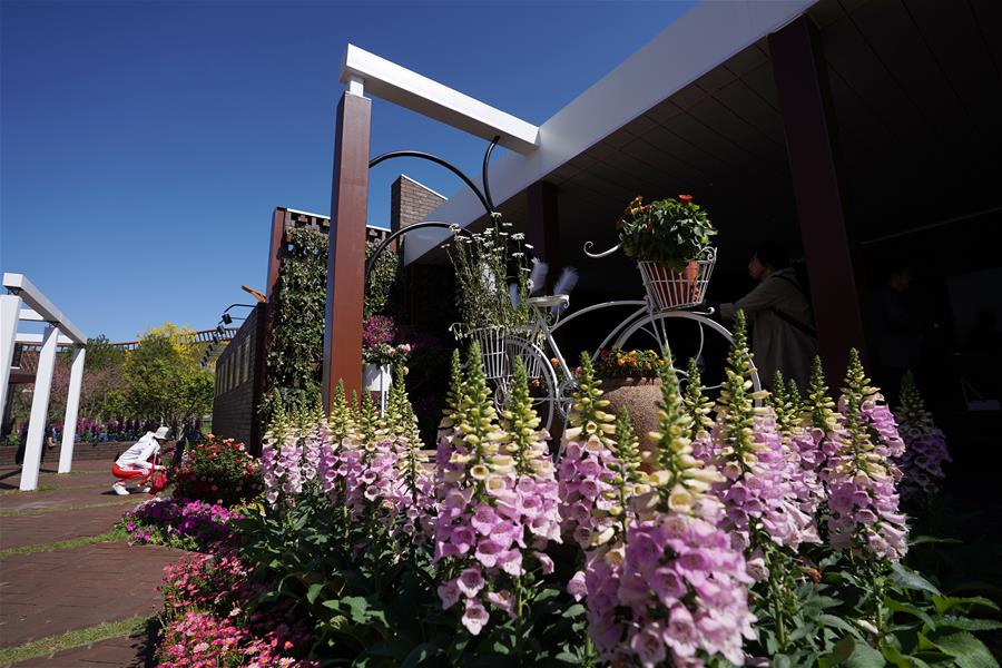 Turistas visitam o Jardim de Tianjin durante o evento "Dia de Tianjin" realizado como parte da Exposi??o Internacional de Horticultura de Beijing no distrito de Yanqing, em Beijing, capital da China, em 5 de maio de 2019. (Xinhua/Ju Huanzong)