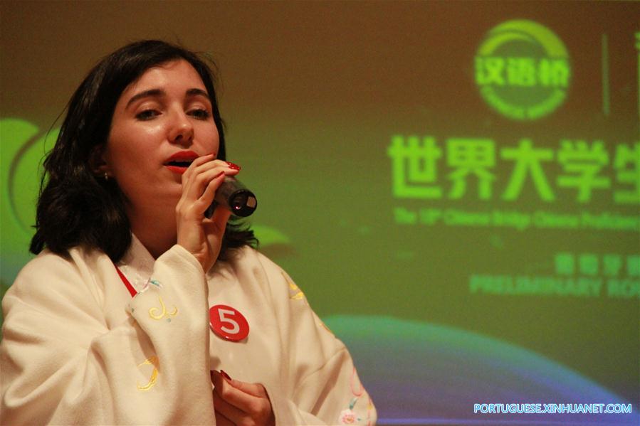 Inês Rosa Locerenco, uma estudante da Universidade de Coimbra, compartilha sua história de aprendizagem do chinês durante a Competi??o de Proficiência Chinesa "Ponte Chinesa" em Braga, Portugal, em 4 de maio de 2019. A 18a Competi??o Competi??o de Proficiência Chinesa "Ponte Chinesa" para estudantes universitários portugueses foi realizada na Universidade do Minho, em Braga, no sábado. (Xinhua/Wen Xinnian)
