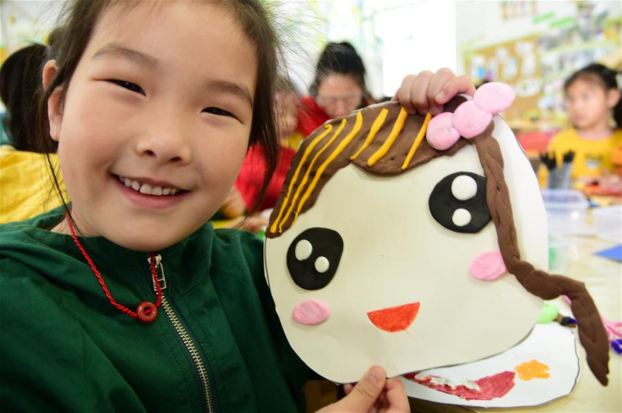 Uma crian?a exibe um cart?o de sorriso para celebrar o próximo Dia Mundial do Sorriso em um jardim de infancia em Zhenjiang, província de Jiangsu, leste da China, em 7 de maio de 2019. O Dia Mundial do Sorriso é comemorado anualmente no dia 8 de maio. (Xinhua/Shi Yucheng)