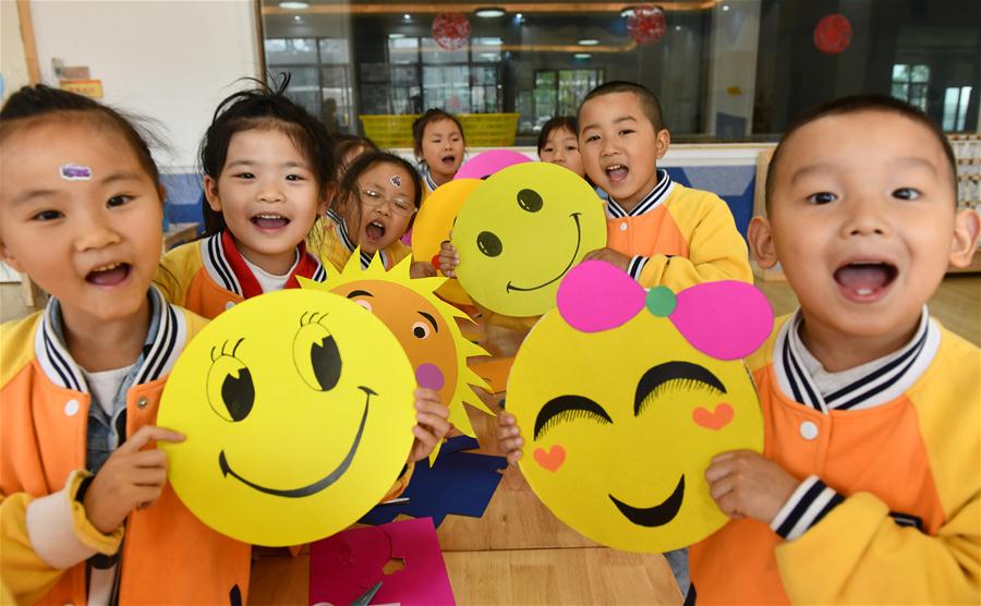 Crian?as exibem cart?es de sorrisos para celebrar o próximo Dia Mundial do Sorriso em um jardim de infancia no distrito de Zigui, província de Hubei, centro da China, em 7 de maio de 2019. O Dia Mundial do Sorriso é comemorado anualmente no dia 8 de maio. (Xinhua/Wang Huifu)