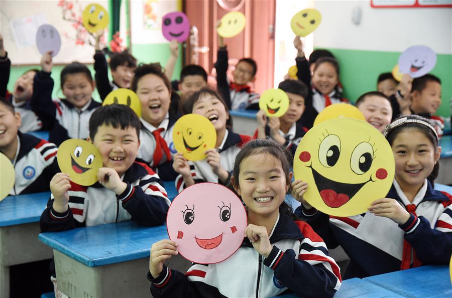 Crian?as exibem cart?es de sorrisos para celebrar o próximo Dia Mundial do Sorriso em uma escola primária em Handan, província de Hebei, norte da China, em 7 de maio de 2019. O Dia Mundial do Sorriso é comemorado anualmente no dia 8 de maio. (Xinhua/Hao Qunying)