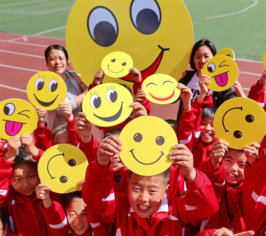 Estudantes exibem cart?es de sorrisos para celebrar o próximo Dia Mundial do Sorriso em uma escola primária em Qinhuangdao, província de Hebei, norte da China, em 7 de maio de 2019. O Dia Mundial do Sorriso é comemorado anualmente no dia 8 de maio. (Xinhua/Cao Jianxiong)
