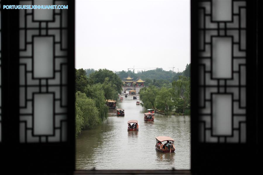 Turistas visitam o Lago Oeste Delgado em Yangzhou, província de Jiangsu, leste da China, em 19 de maio de 2019, o Dia do Turismo na China.
