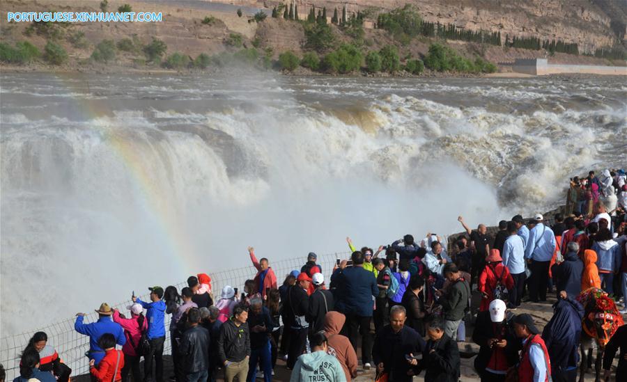 Turistas visitam a Cachoeira Hukou do Rio Amarelo no distrito de Jixian, província de Shanxi, norte da China, em 19 de maio de 2019, o Dia do Turismo na China.