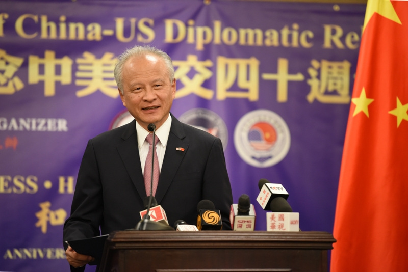 Falando em um evento celebrando o 40o aniversário do estabelecimento de la?os bilaterais, Cui observou que algumas pessoas afirmaram que, como a China segue um caminho de desenvolvimento diferente, ela certamente vai “concorrer com a América", ou, mais longe ainda, caminhar para uma "nova Guerra Fria".