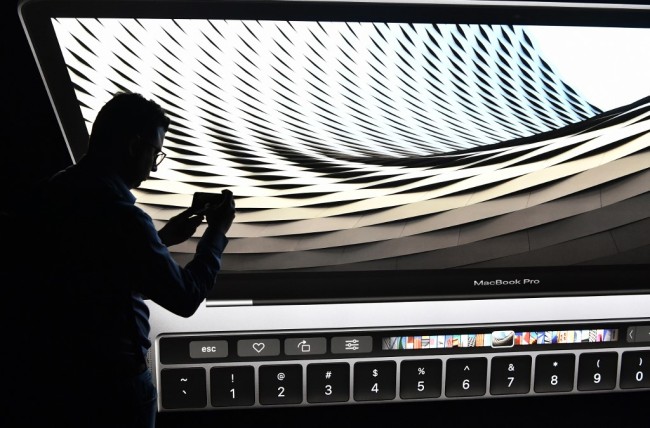 Um membro da imprensa passa junto de um anúncio ao MacBook Pro durante um lan?amento de produto da Apple, na sede da empresa, em Cupertino, Califórnia, a 27 de outubro de 2016. Foto: AFP
