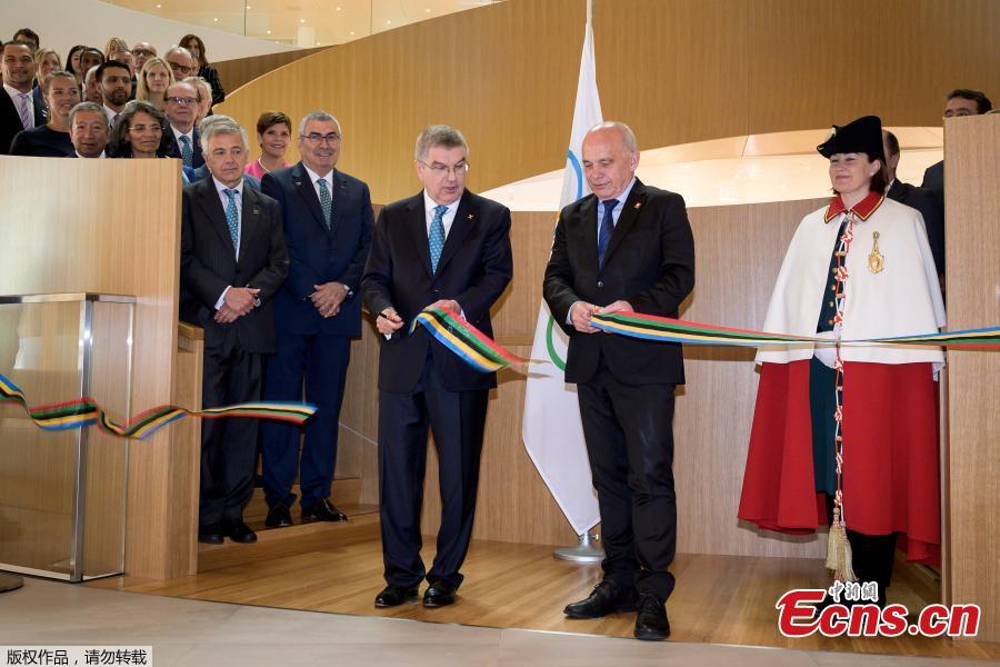 Thomas Bach, presidente do Comité Olímpico Internacional (COI) e Ueli Maurer, presidente da Suí?a cortaram a fita durante a inaugura??o da sede nova do COI, em Lausanne, Suí?a, a 23 de junho de 2019.