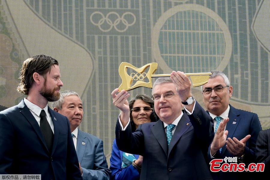 Thomas Bach, presidente do Comité Olímpico Internacional (COI) apresenta a chave, ao lado de Jan Ammundsen, arquiteto sênior, durante a inaugura??o da sede nova do COI em Lausanne, Suí?a, a 23 de junho de 2019.