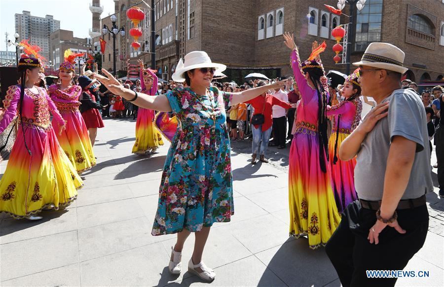 Turistas dan?am com artistas no Grande Bazar Internacional de Xinjiang em Urumqi, capital da Regi?o Autónoma Uigur de Xinjiang, no dia 2 de julho de 2019. O Grande Bazar Internacional em Urumqi é um destino turístico popular, tendo recebido mais de 1,7 milh?o de turistas desde o junho.
