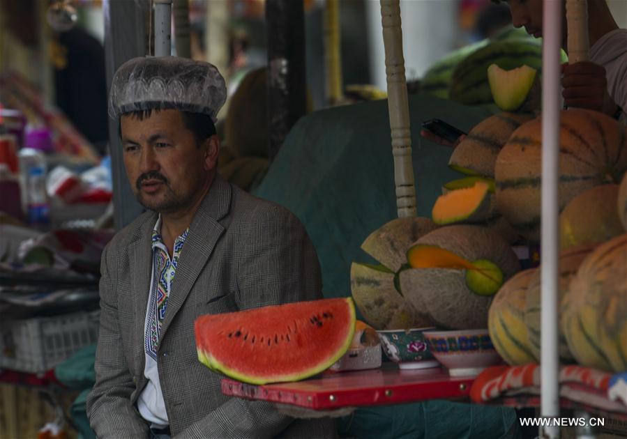 Um vendedor vende mel?es, um fruto popular na Regi?o Aut?noma de Xinjiang, no noroeste da China. A cidade de Kashgar recebeu mais de 310.000 turistas na primeira metade de 2019.
