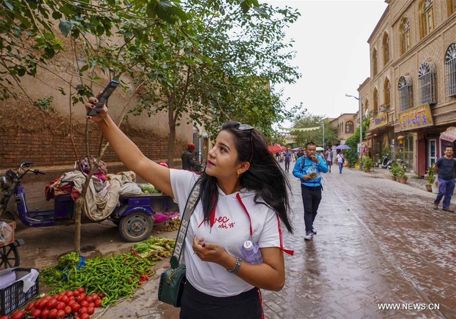 Uma mulher local tira selfies na cidade antiga de Kashgar da Regi?o Aut?noma de Xinjiang, no noroeste da China. A cidade de Kashgar recebeu mais de 310.000 turistas na primeira metade de 2019.