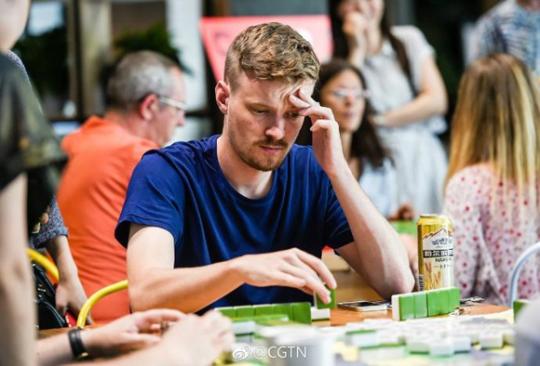 Um homem aprende a jogar mahjong durante uma aula em Chengdu, província de Sichuan, no sudoeste da China, no sábado. O estudante foi um dos cerca de quinze estrangeiros que fizeram a aula ensinada em inglês. (Foto/conta do Weibo do CGTN)