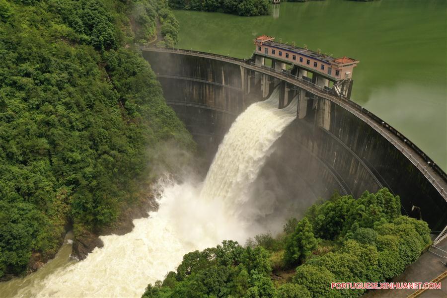 Foto de 10 de julho de 2019 mostra a água que jorra para fora do reservatório de Jinxi no distrito de Yongjia em Wenzhou, província de Zhejiang, leste da China. Na quarta-feira, o reservatório come?ou a descarregar a água da enchente trazida pelas fortes chuvas contínuas.