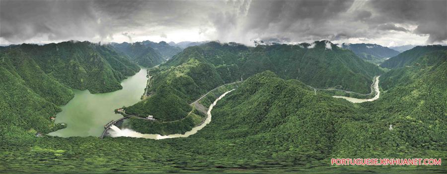 Foto de 10 de julho de 2019 mostra a água que jorra para fora do reservatório de Jinxi no distrito de Yongjia em Wenzhou, província de Zhejiang, leste da China. Na quarta-feira, o reservatório come?ou a descarregar a água da enchente trazida pelas fortes chuvas contínuas.