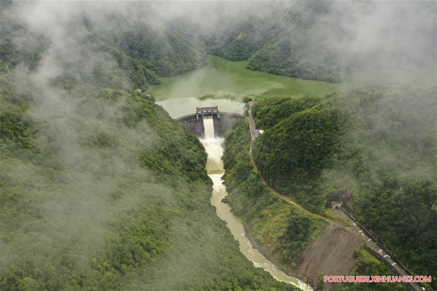 Foto de 10 de julho de 2019 mostra a água que jorra para fora do reservatório de Jinxi no distrito de Yongjia em Wenzhou, província de Zhejiang, leste da China. Na quarta-feira, o reservatório come?ou a descarregar a água da enchente trazida pelas fortes chuvas contínuas.