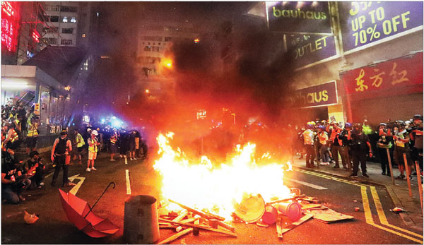 A fuma?a sufoca o bairro comercial de Causeway Bay na noite de domingo depois que os manifestantes atearam fogo a diferentes objetos na rua durante uma manifesta??o autorizada.