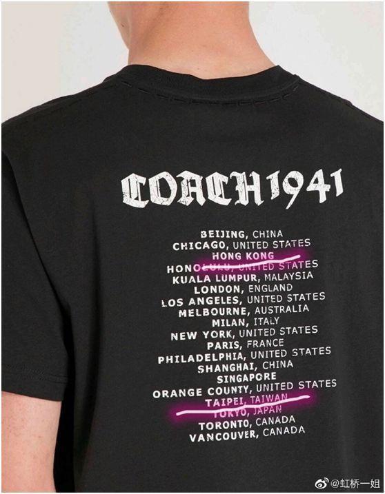 Na parte de trás da camiseta, que é chamada de "COACH1941", há muitos nomes de cidades e seus respectivos países. Beijing e Shanghai est?o acompanhados da China. No entanto, Hong Kong aparece individualmente, n?o houve acréscimo da palavra "China". Já Taipei foi integrada à "Taiwan" , em uma lista que inclui cidades de países como Canadá, China e Estados Unidos.
