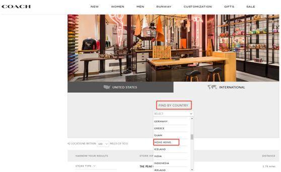 Ao mesmo tempo, ao procurar as lojas da Coach em seu site oficial, é possível optar em "Escolher por país", e as op??es incluem Hong Kong, Macau e Taiwan, juntamente com outros países como China e Estados Unidos.