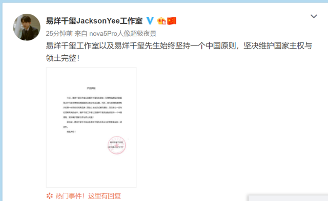 O estúdio do ator chinês Yiyang Qianxi enviou uma declara??o dizendo que havia emitido um aviso de rescis?o formal para a marca de cosméticos Givenchy ao primeiro instante e suspendeu imediatamente toda a coopera??o relacionada com a Givenchy. A declara??o também dizia que o estúdio de Yiyang Qianxi bem como ele mesmo sempre aderiram ao princípio de uma só China e salvaguardaram resolutamente a soberania nacional e integridade territorial.