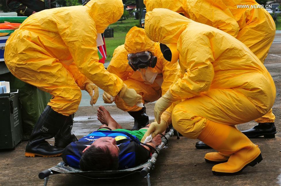 Os membros participam no exercício conjunto de resgate humanitário e médico China-Laos “Trem de Paz - 2019” em Vietiane, capital do Laos, a 18 de agosto de 2019.