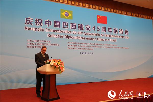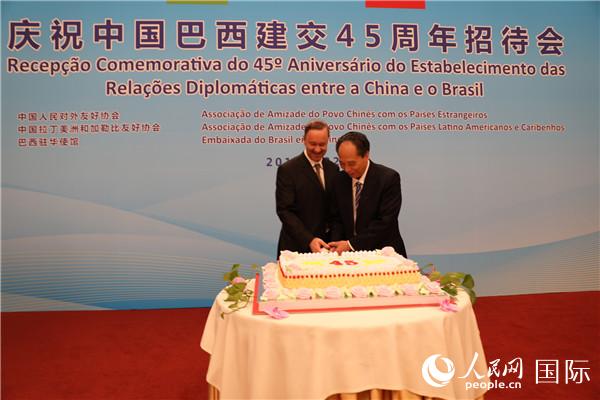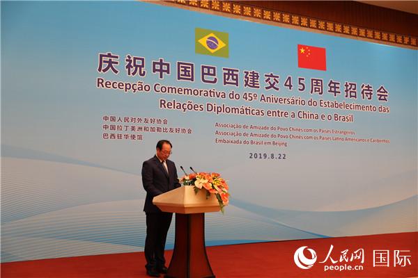 Beijing, 23 ago (Diário do Povo Online) – A recep??o comemorativa do 45o aniversário do estabelecimento das rela??es diplomáticas foi realizada em Beijing no dia 22 de agosto. O vice-presidente do Comitê Permanente da Assemblia Popular Nacional da China, Ji Bingxuan, o vice-ministro das Rela??es Exteriores, Zheng Zeguang, o vice-presidente da Associa??o do Povo Chinês com os Países Estrangeiros, Song Jingwu, o embaixador brasileiro na China, Paulo Estivallet de Mesquita, e centenas de representantes dos dois países participaram da recep??o.