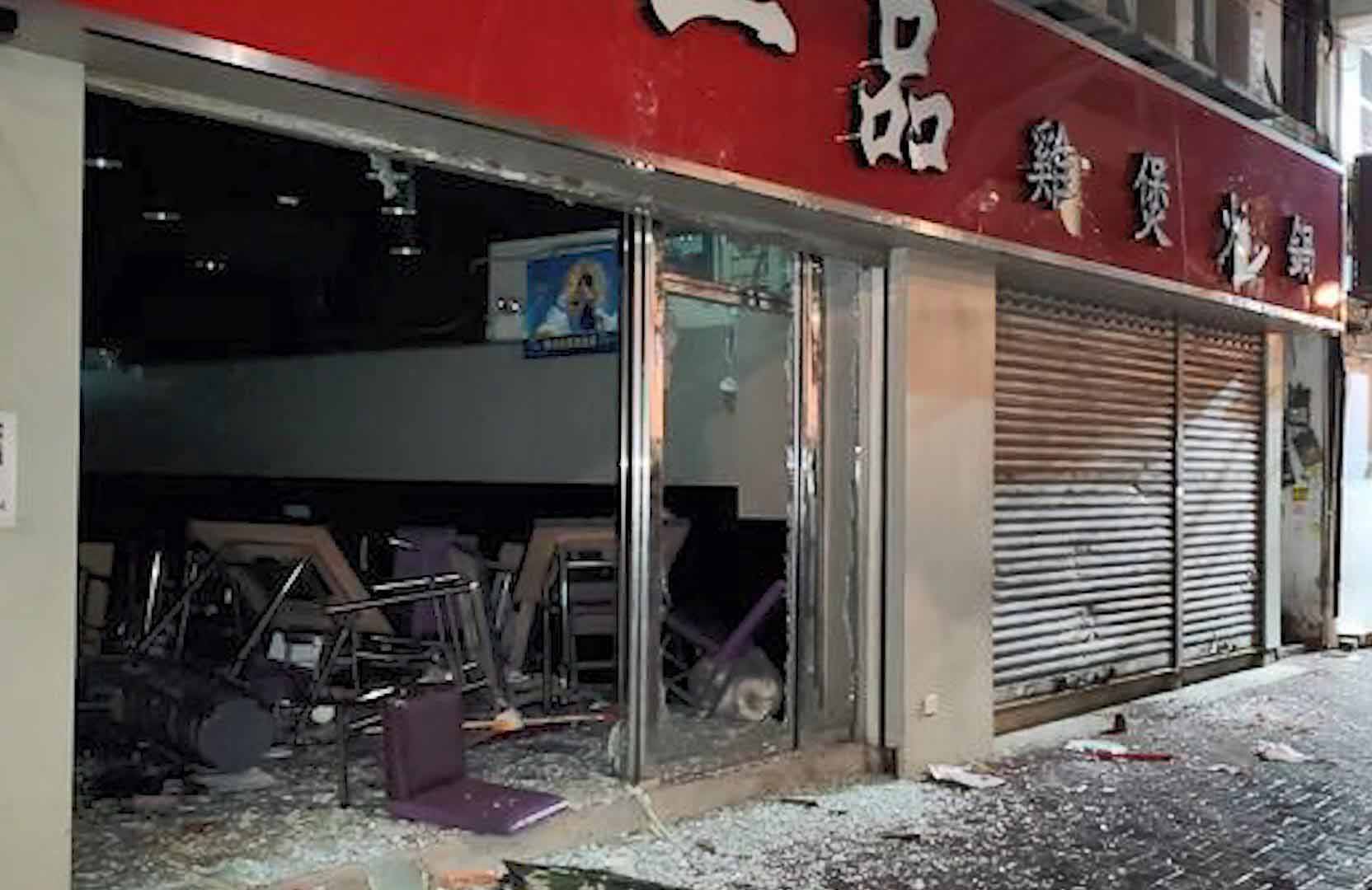 De acordo com a Orange News, um portal de notícias de Hong Kong, pelas cerca de 19h40, um grupo de manifestantes equipados com bast?es de ferro, tacos e tijolos, atacou várias lojas ao longo da rua, destruindo pelo menos um restaurante e uma loja de mahjong.