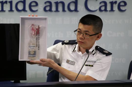 Mak Chin-ho, comissário assistente de opera??es policiais em Hong Kong, exibe uma bomba de gasolina confiscada durante as assembléias n?o autorizadas do fim de semana, em uma conferência de imprensa na sede da polícia em Wan Chai na segunda-feira (2). (Foto /China Daily)
