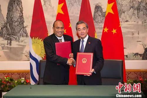 O conselheiro de Estado chinês e ministro das Rela??es Exteriores, Wang Yi, e o presidente de Kiribati, Taneti Maamau, também chanceler do país, assinaram na última sexta-feira (27), um comunicado conjunto sobre o restabelecimento das rela??es diplomáticas entre a República Popular da China e a República de Kiribati, na Miss?o Permanente da China junto às Na??es Unidas em Nova Iorque.