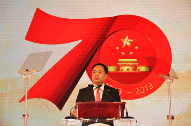 A Embaixada da China no Brasil realizou no dia 25 uma recep??o em Brasília para comemorar os 70 anos da República Popular da China e os 45 anos do estabelecimento das rela??es diplomáticas entre a China e o Brasil. O embaixador chinês no Brasil, Yang Wanming, o vice-ministro das Rela??es Internacionais do Brasil, Reinaldo Salgado, e outras mais 1000 pessoas participaram do evento.