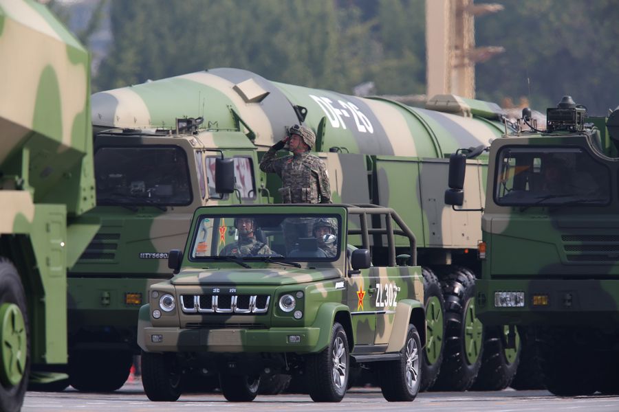 Uma forma??o de mísseis convencionais e nucleares Dongfeng-26 passa por revista em uma parada militar em Beijing, marcando o 70o aniversário de funda??o da República Popular da China em 1o de outubro de 2019. (Xinhua)