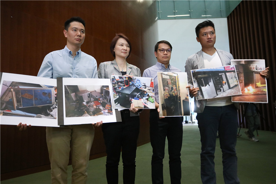 Starry Lee Wai-king (segundo à esquerda), presidente da Alian?a Democrática para a Melhoria e o Progresso de Hong Kong (DAB), e outros membros da alian?a exibem fotos de danos causados por manifestantes em uma filial da DAB. [Foto/China Daily]