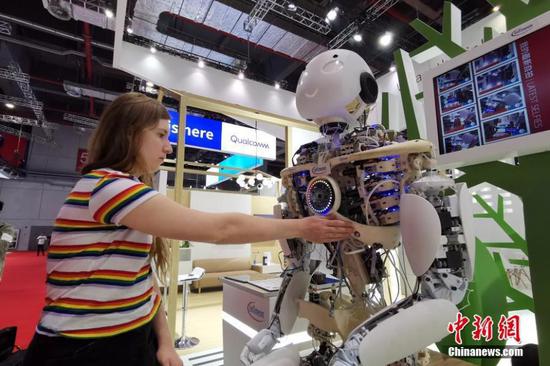 Um visitante interage com um rob? em exibi??o na segunda Exposi??o Internacional de Importa??o da China (CIIE, na sigla em inglês), em Shanghai, em 4 de novembro, 2019. (Foto: China News Service/Han Haidan)