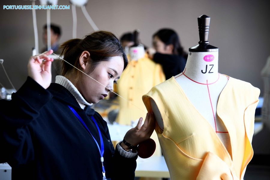 Participantes competem no concurso de tecnologia da moda em uma escola profissionalizante na cidade de Weihai, da Província de Shandong, leste da China, em 11 de novembro de 2019.