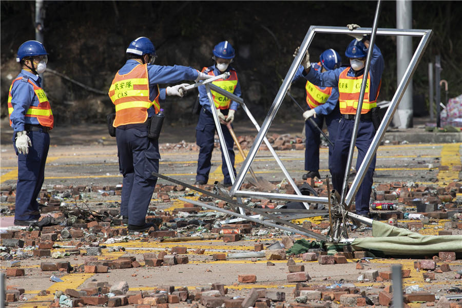 Os trabalhadores limpam uma estrada fora da Universidade Politécnica de Hong Kong na Regi?o Administrativa Especial na quarta-feira (20).