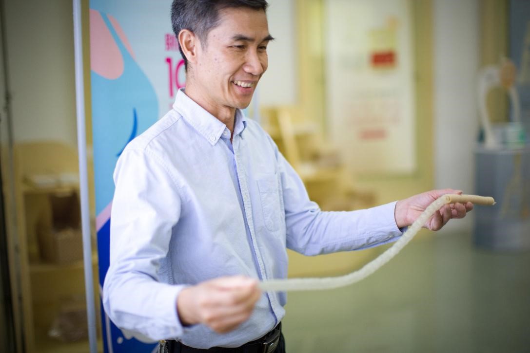 Ru Xiquan, vice-presidente do grupo Shenguan Holding Co., Ltd., exibe uma amostra de revestimento de colágeno. (Foto/Diário do Povo Online)