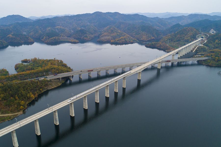 Foto aérea tirada em 26 de novembro de 2019 mostra um trem passando por uma ponte sobre o reservatório Danjiangkou durante uma prova da ferrovia de alta velocidade Wuhan-Shiyan na Província de Hubei, centro da China.