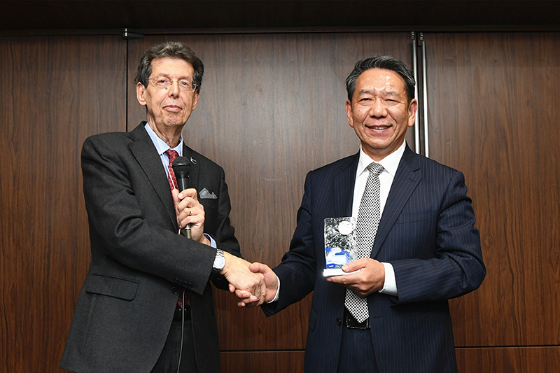 O presidente da Moon Village, Giuseppe Reibaldi, concede o prêmio a Wu Weiren, projetista-chefe do projeto de explora??o lunar da China