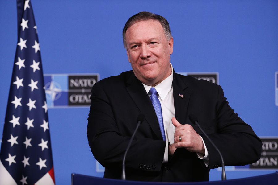 O secretário de Estado dos Estados Unidos, Mike Pompeo, assiste a uma conferência de imprensa depois da reuni?o do Conselho do Atlantico Norte de nível de ministros de Rela??es Exteriores, na sede da Organiza??o do Tratado do Atlantico Norte (OTAN), em Bruxelas, Bélgica, em 20 de novembro de 2019.