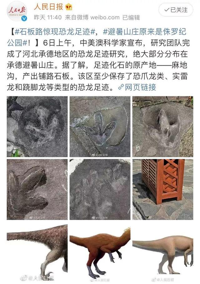 Em uma coletiva de imprensa realizada pelo Bir? Municipal de Relíquias de Chengde e, a Universidade de Geociência da China, os cientistas revelaram que as 300 pegadas de dinossauro foram encontradas em 150 pedras de pavimenta??o. Segundo a equipe geológica, a maior parte das pegadas está distribuída no resort de montanha de Chengde, um jardim imperial da dinastia Qing.