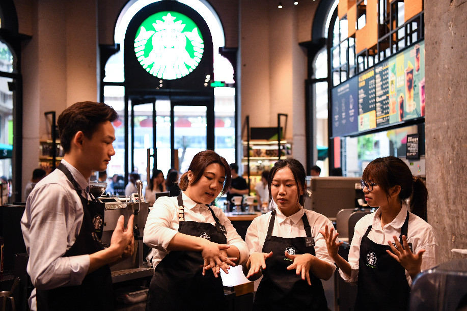 Funcionários praticam linguagem gestual em uma loja de café da Starbucks em Guangzhou, Província de Guangdong, sul da China, em 19 de maio de 2019.