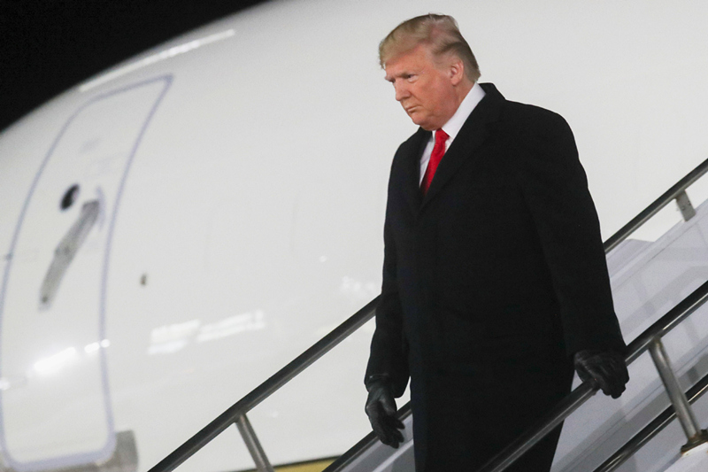 O presidente dos EUA, Donald Trump, desembarca do Air Force One ao chegar ao Aeroporto W.K. Kellogg, em Battle Creek, Michigan, EUA, a 18 de dezembro de 2019.