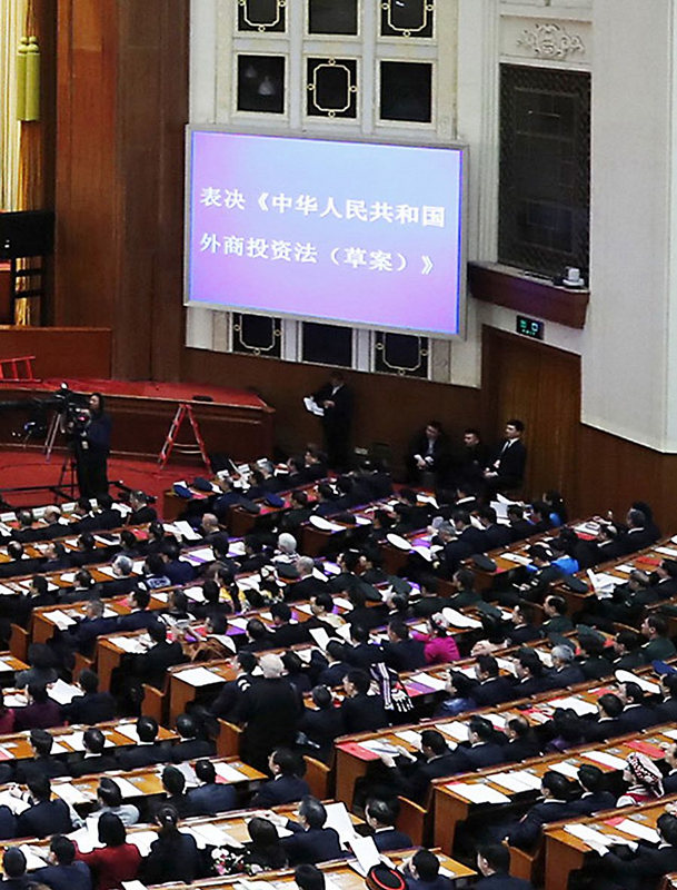 A segunda sess?o da 13a Assembleia Popular Nacional (APN) realiza sua reuni?o de encerramento no Grande Palácio do Povo em Beijing, capital da China, em 15 de mar?o de 2019. O legislativo nacional da China aprovou a lei de investimento estrangeiro na reuni?o.