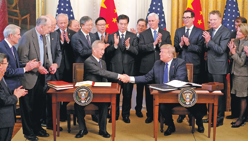 O vice-primeiro-ministro Liu He e o presidente dos Estados Unidos, Donald Trump, apertam as m?os depois de assinarem a primeira fase do acordo comercial China-EUA na Casa Branca na quarta-feira. Wang/ Xinhua