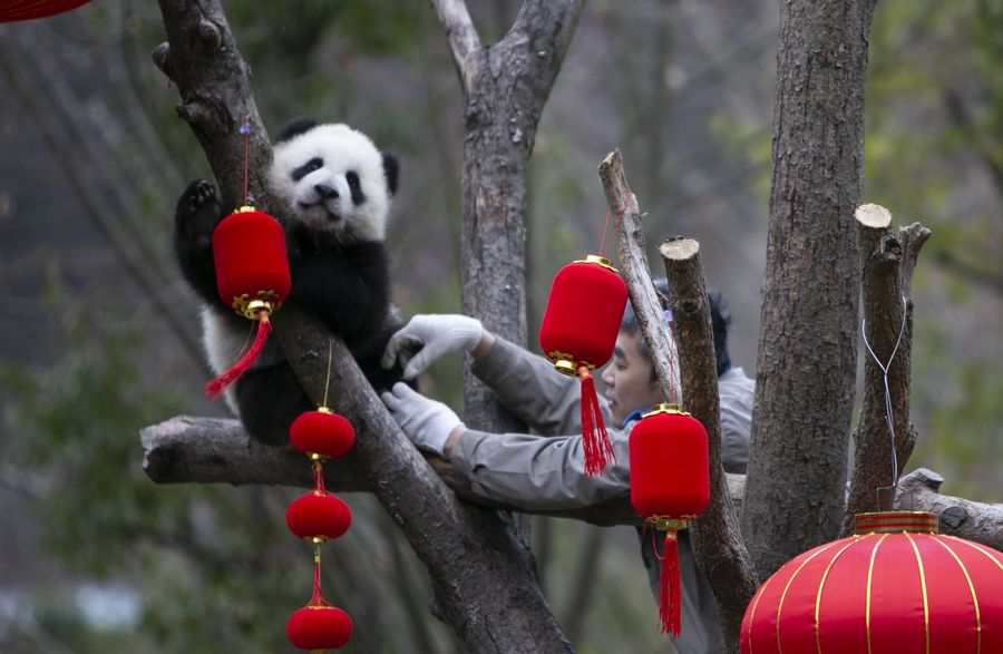 Em uma área festivamente decorada da base de cria??o de Shenshuping, os filhotes, cada um segurado por seu próprio criador, posaram para as cameras para enviar ao mundo suas sauda??es para o Ano Novo Lunar Chinês.