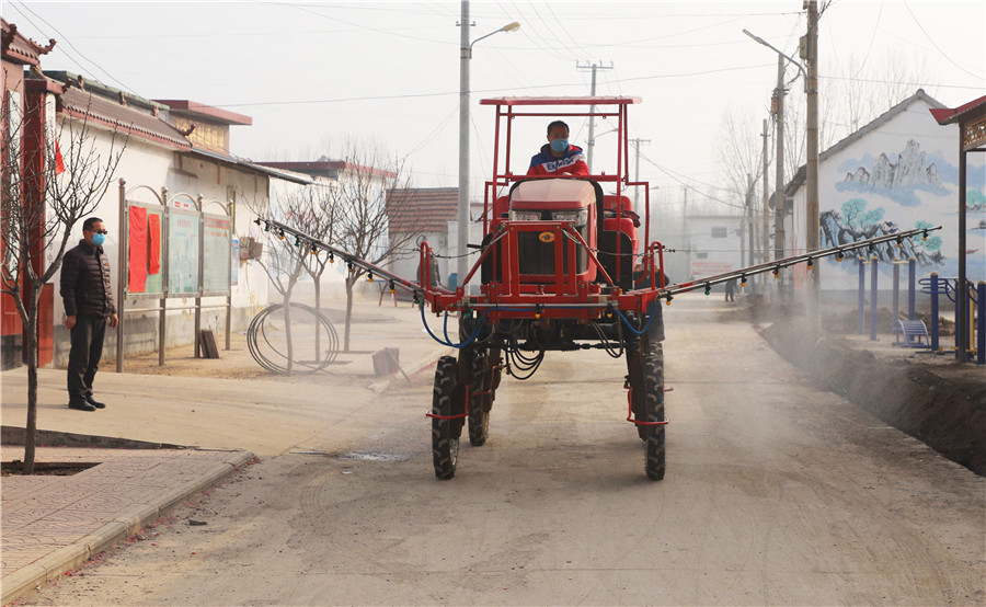 Um trator pulveriza desinfetante para esterilizar uma vila no município de Mingji, Zouping, na província de Shandong, em 29 de janeiro de 2020.