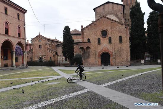 Uma pessoa usando uma máscara facial anda de bicicleta em Bolonha, Itália, em 30 de mar?o de 2020. (Foto de Gianni Schicchi / Xinhua)