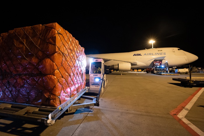 Em 29 de mar?o, horário da leste dos EUA, um voo saindo de Shanghai aterrissou no Aeroporto Internacional John F. Kennedy de Nova York, sendo o primeiro de 22 voos para os Estados Unidos com suprimentos médicos necessários com urgência. O avi?o transportava 12 milh?es de pares de luvas, 130.000 máscaras N95, 1,7 milh?o de máscaras cirúrgicas, 50.000 conjuntos de roupas de prote??o, 130.000 desinfetantes para as m?os e 36.000 term?metros.