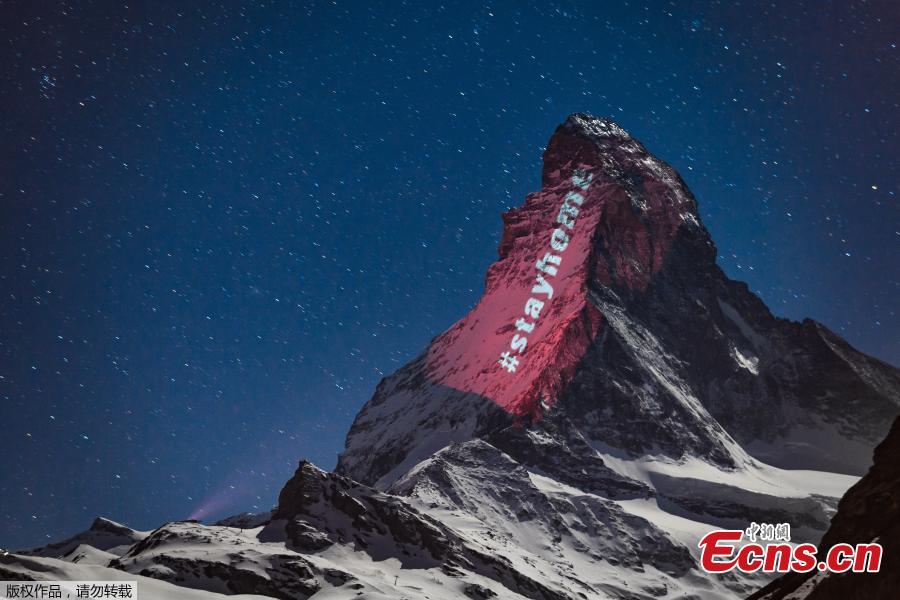 Uma foto tirada em 1o de abril de 2020 no resort alpino suí?o de Zermatt mostra a montanha Matterhorn, localizada na fronteira ítalo-suí?a, com picos de 4,478 metros iluminados "como um sinal de esperan?a e solidariedade" pelo artista de luz suí?o Gerry Hofstetter durante a pandemia de Covid -19.