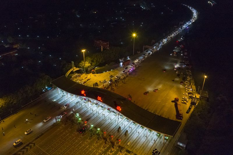 Automóveis atravessam um pedágio de uma autoestrada no oeste de Wuhan, em 8 de abril.