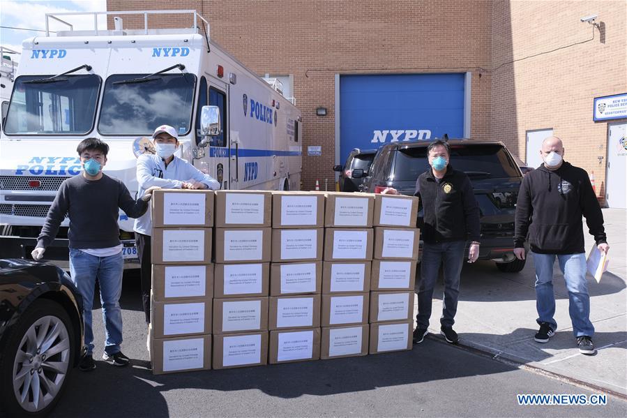 Uma foto dos voluntários das Associa??es sino-americanas do leste dos EUA com um policial depois de entregar 30,000 máscaras doadas ao Departamento de Polícia de Nova York, EUA, em 1o de abril de 2020.